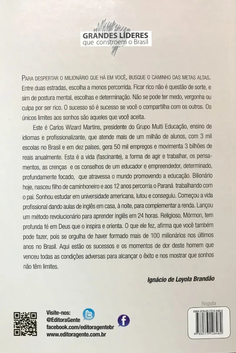 Entre duas estradas, escolha a menos percorrida. Ficar rico não é questão de sorte, e sim de postura mental, escolhas e determinação. Não se pode ter medo, vergonha ou culpa por ser rico. O sucesso só é sucesso se você o compartilha com os outros. Os únicos limites aos sonhos são aqueles que você aceita. Este é Carlos Wizard Martins, presidente do Grupo Multi Educação, ensino de idiomas e profissionalizante, que atende mais de um milhão de alunos, com 3 mil escolas no Brasil e em dez países, gera 50 mil empregos e movimenta 3 bilhões de reais anualmente. Essa é a vida (fascinante), a forma de agir e trabalhar, os pensamentos, as crenças e os conselhos de um educador e empreendedor, determinado, profundamente focado, que atravessa o mundo pro movendo a educação. Bilionário hoje, nasceu filho de caminhoneiro e aos 12 anos percorria o Paraná trabalhando com o pai. Sonhou estudar em universidade americana, lutou e conseguiu. Começou a vida profissional dando aulas de inglês em casa, à noite, para complementar a renda. Lançou um método revolucionário para aprender inglês em 24 horas. Religioso, Mórmon, tem profunda fé em Deus que o inspira e orienta. O que ele fez, afirma que você também pode fazer, pois se orgulha de haver formado mais de 100 milionários nos últimos anos no Brasil. Nesse livro estão os sucessos e os momentos de dor desse homem que venceu todas as condições adversas para alcançar o êxito e nos mostrar que sonhos não têm limites.